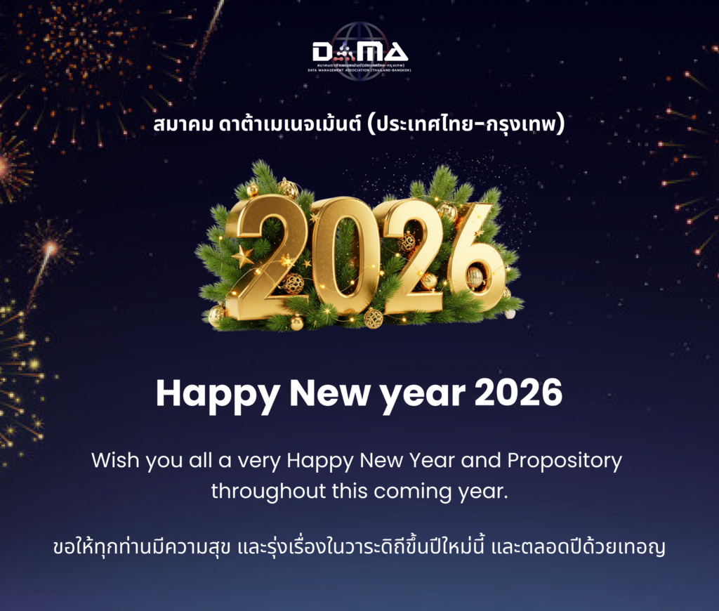 ขอให้ปีใหม่นี้เป็นปีแห่ง ความสุข ความสำเร็จ และสุขภาพที่แข็งแรง ก้าวสู่ทุกเป้าหมายอย่างมั่นใจ พร้อมแรงบันดาลใจใหม่ ๆ ในการร่วมกันขับเคลื่อน Data Management & Data Governance รวมทั้ง AI เพื่อสร้างองค์กรและประเทศที่ ขับเคลื่อนด้วยข้อมูลและ AI อย่างรับผิดชอบ (responsible AI)